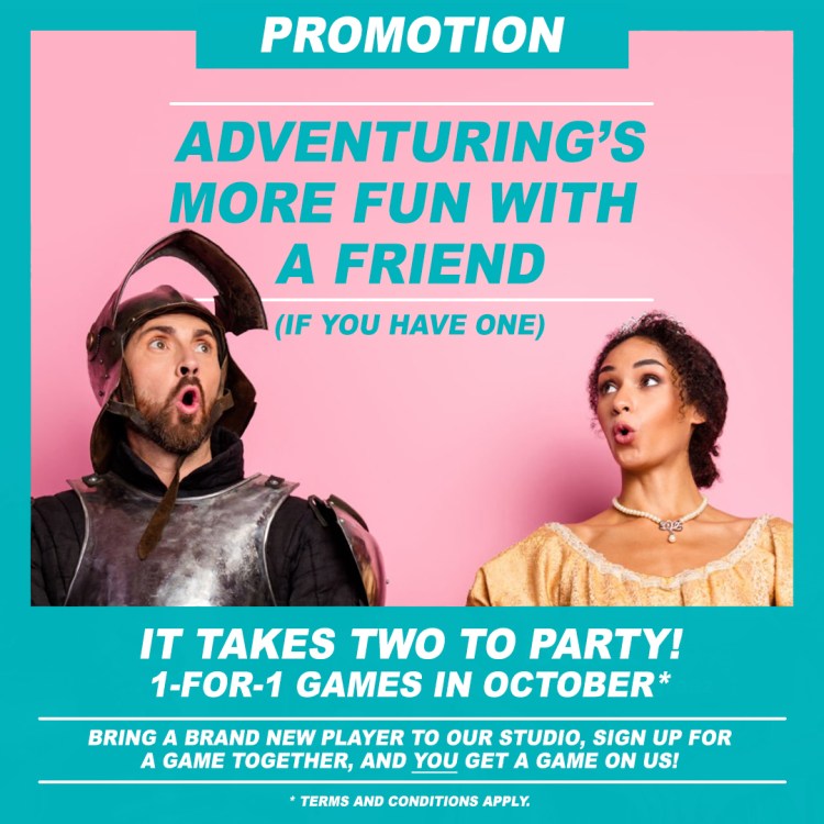As part of our October activities, you get to play free if you bring along a brand new player who has never visited our HQ before to play a game. This promotion is applicable to any game you register for, and valid once per visit!